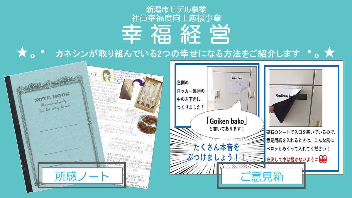 そこで、新潟市モデル事業の「幸福経営」に参加!幸福経営のコンサルティングの方からコーチングしていただき、再び社内の一致団結力を高めようという働きに出ました。