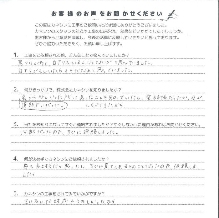 この度は白蟻防除のご依頼を頂き誠に有難うございました。
