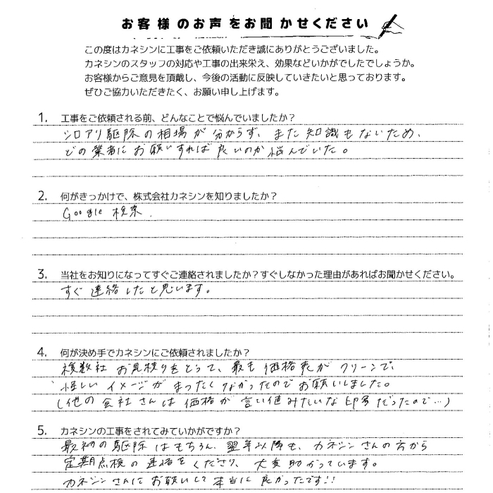 今回白蟻駆除のご依頼を頂きまして誠に有難うございました。