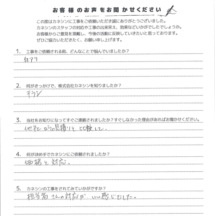 この度は白蟻駆除のご依頼を頂き誠に有難うございました。