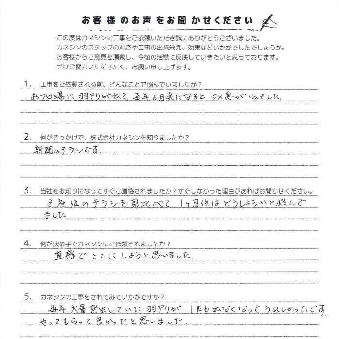 毎年大量発生していた羽アリが1匹も出なくなってうれしかったです。