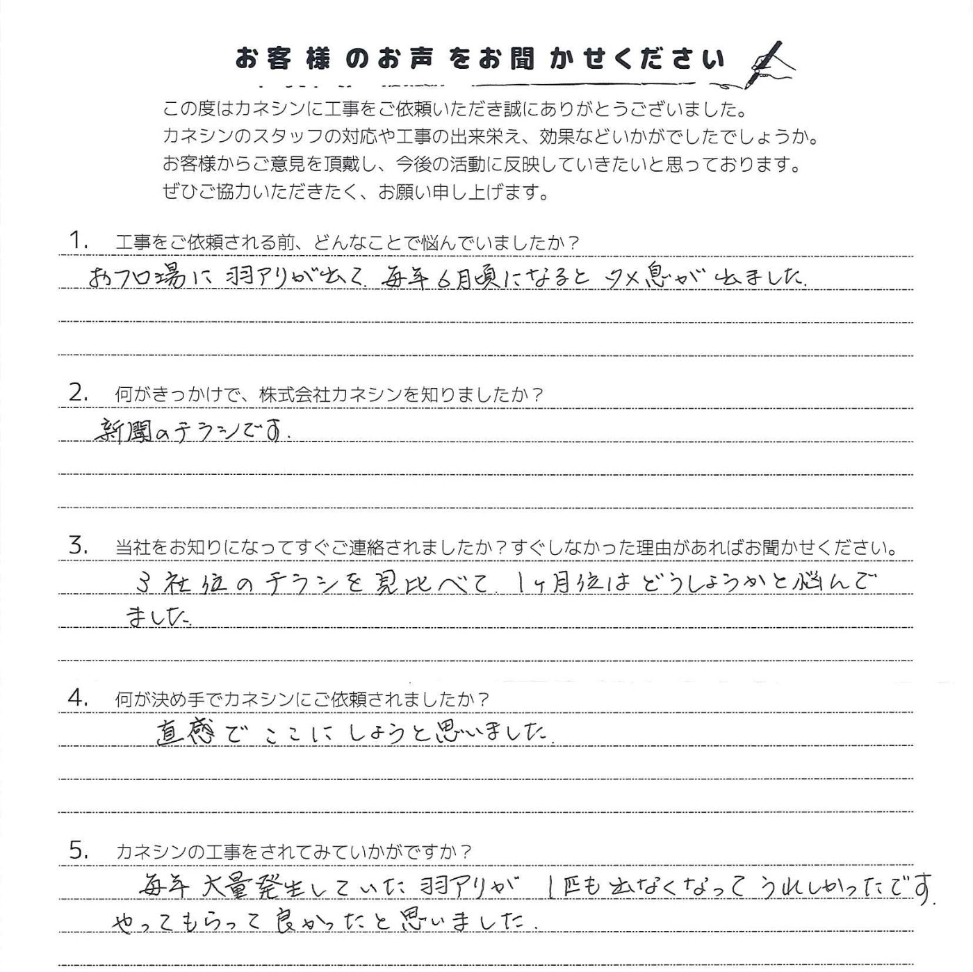 今回白蟻駆除のご依頼を頂きまして誠に有難うございました。