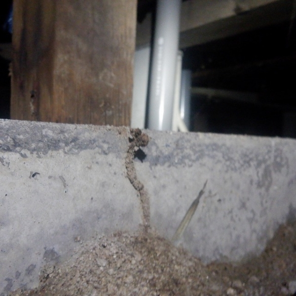 これは白蟻が風や光・外敵などから自分の身を守り、地中からエサ場となる床下木部に辿り着くために通る道です。