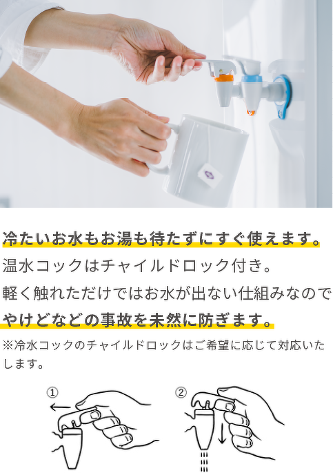 冷たいお水もお湯もすぐに使えるし、何よりチャイルドロックも付いているので子供がいても安心して使える!と教えていただきました。ありがとうございます。